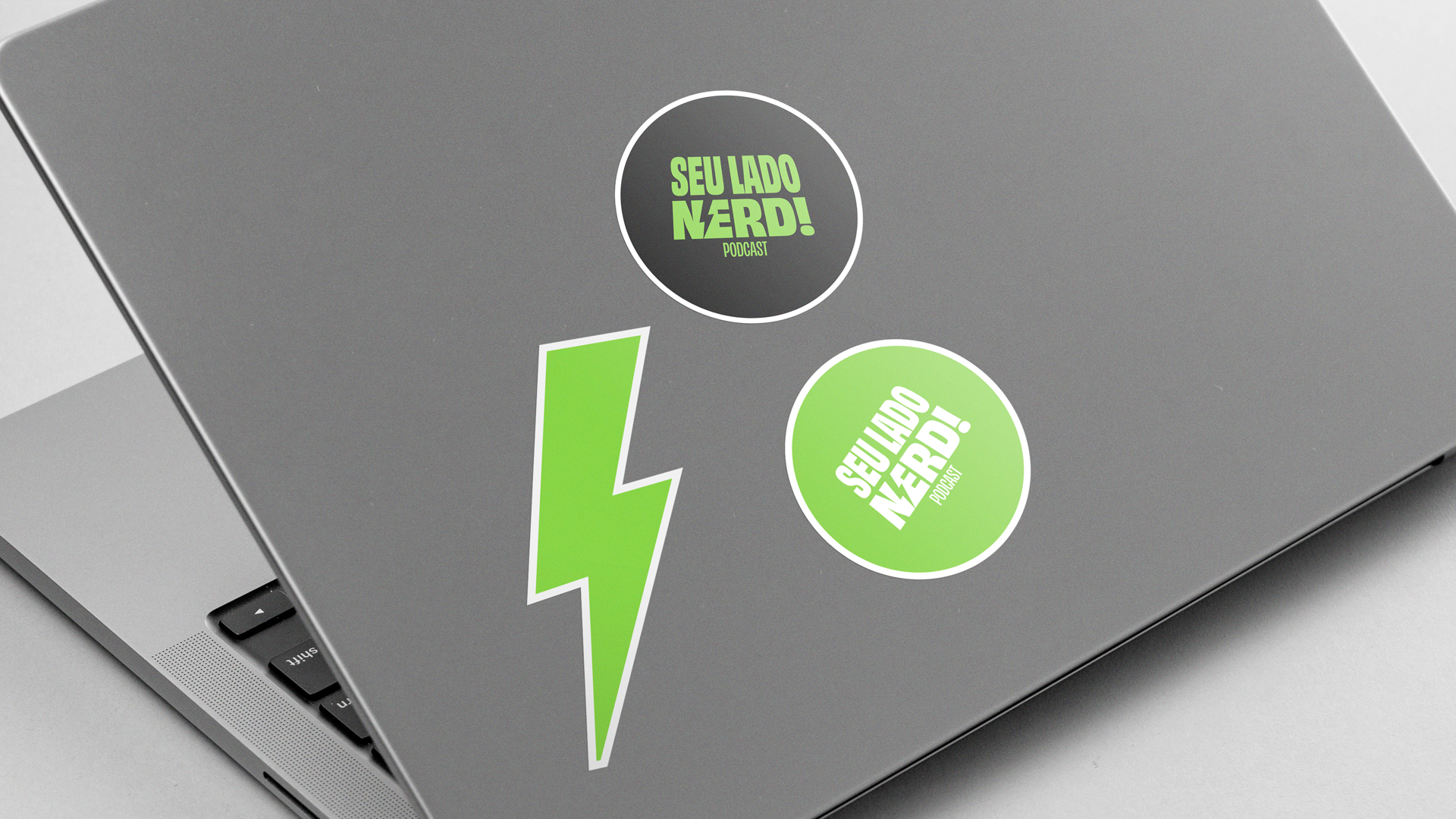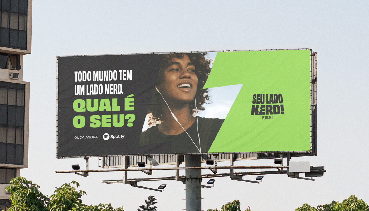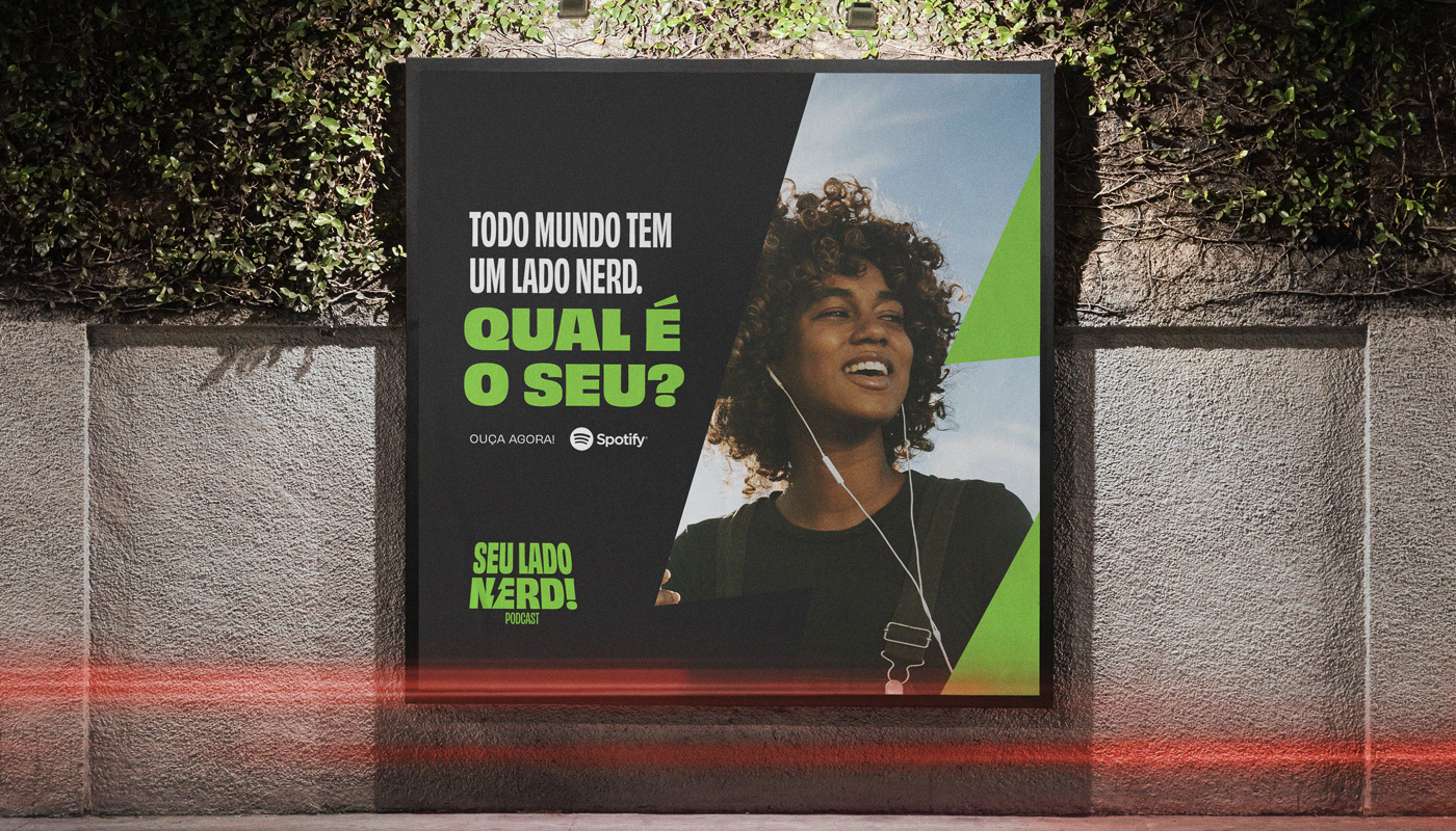A identidade visual precisava ser descontraída, jovem e vibrante. A tipografia brinca com o condensado e o estendido para representar diferentes tipos de voz e entonação através das letras. Ela possui uma inclinação como referência ao letreiro de entrada da franquia "Star Wars". A cor verde e o raio são outros elementos associados a poder e magia dentro do universo dos super-heróis, por isso eles foram utilizados para trazer ainda mais a personalidade nerd para a assinatura visual.